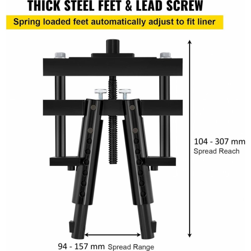 Equipped with spring-loaded feet, the puller can automatically be adjusted to fit the liner so that you don't need to operate the swing arms manually. The adjustable spread range is from 94 mm iki 157 mm, suitable for most wet cylinder liners. Plus, there are 7 holes in the lower leg so that you can adjust the length of the rod according to the depth of the cylinder.