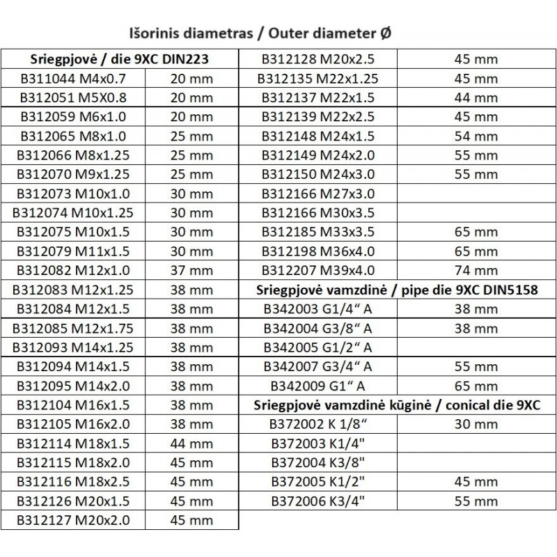 Jūsu iepirkumu grozs ir tukšs! Mašīnas un rokas apaļo vītņu presformas 9XC DIN223 / M9x1.25